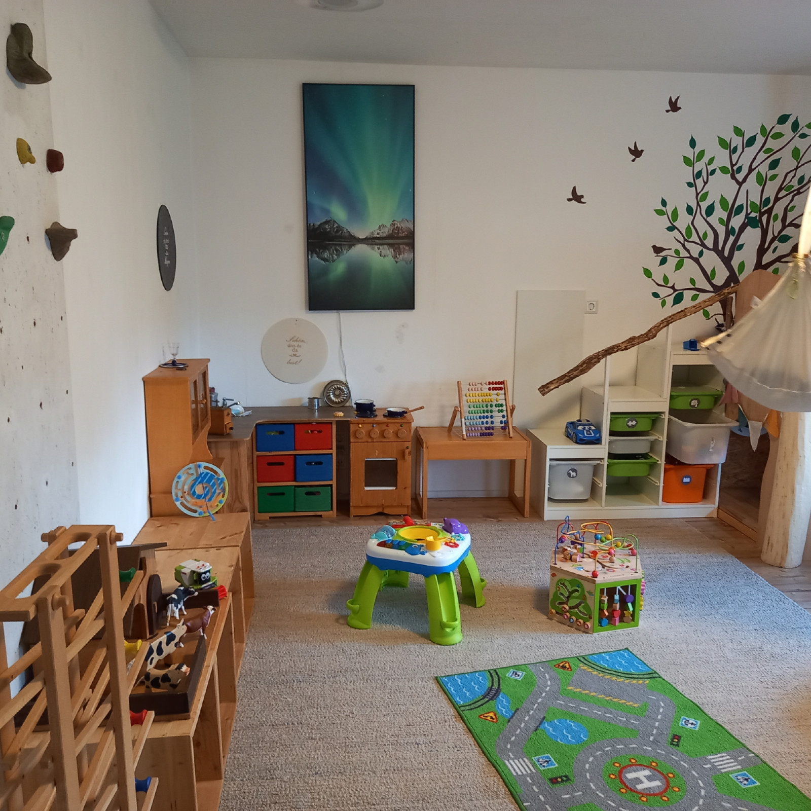 Kinder haben besondere Bedürfnisse an die Einrichtung: der Waschbereich hat einen Wickeltisch, niedrige Waschbecken und eine separate Toilette. Für den Mittagsschlaf oder um sich auszuruhen gibt es den Schlafbereich mit einer eigenen Matratze für jedes Kind. Die Küche ist besonders wichtig: hier bereiten wir – auch oft gemeinsam mit den Kindern – die Mahlzeiten zu und lassen es uns zusammen am großen Tisch schmecken. In den Räumen gibt es verschiedene Bereiche zum Basteln oder Spielen – mache Bereiche werden auch für verschiedene Anlässe umgeräumt. In den Räumen wird natürlich nicht geraucht.
